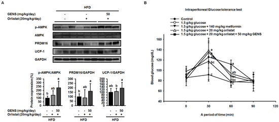 To further analyze whether GENS and orlistat plays a role in systemic glucose sensitivity, we performed IPGTT. As shown Figure 7B, the 1.0 g/kg glucose control group reached a glucose level of 138.7 ± 23.7 mg/dL at 30 min. On the other hand, the groups that received combination group (20 mg/kg orlistat + 50 mg/kg GENS) had a significantly suppressed rise in blood glucose, with glucose levels of 125.8 ± 8.9 mg/dL at 30 min. In comparison with the 1.0 g/kg glucose control group, the group that was administered combination group (20 mg/kg orlistat + 50 mg/kg GENS) significantly decreased their blood glucose levels by approximately 9.3% at 30 min. In the current study, our result showed GENS improved glucose homeostasis in vivo. Moreover, the group that was administered 200 mg/kg GENS and combination group (20 mg/kg orlistat + 50 mg/kg GENS) had a significant decrease in blood glucose levels after glucose loading.