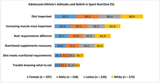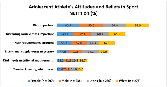 None of the above studies have examined differences in sport nutrition knowledge, attitudes and beliefs in adolescent athletes based on sex, race/ethnicity, or socioeconomic status. Female adolescent athletes have different nutrition and body weight and image issues compared to adolescent male athletes [17,18]. They are also at greater risk for health issues related to poor nutrient and energy intakes, such as iron deficiency anemia, disordered eating, stress fractures, and the female athlete triad [19,20,21].