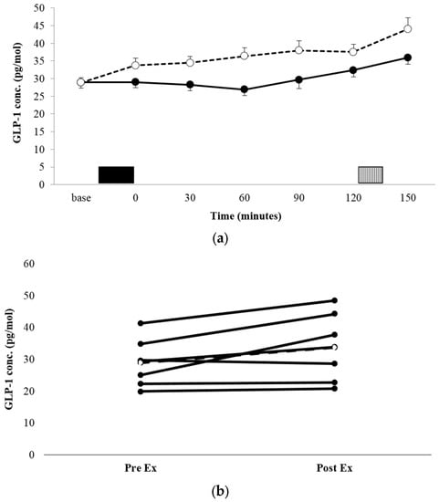 Interestingly, when inspecting the individual responses of GLP-1 to exercise, there appears a difference between males and females. All four males exhibited immediate post-exercise increases in GLP-1 concentrations of between 15% and 50%, while the three females did not exhibit post-exercise changes. A previous investigation has provided some evidence that an attenuation of the GLP-1 response to a glucose load in overweight, prediabetic, and diabetic individuals, compared with those with normal glucose tolerance, is more pronounced in females []. However, recent studies would indicate no sex differences in acute appetite and appetite-associated hormone responses to exercise in healthy-weight individuals [,,].