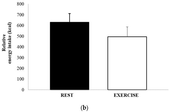 The mean absolute energy intake and mean relative energy intake for both REST and EX are shown in Figure 4a,b. There was no significant difference in either energy intake (1051 ± 502 kcal vs. 1052 ± 615 kcal, p = 0.991, d = 0.002), or relative energy intake (630 ± 458 kcal vs. 494 ± 514 kcal, p = 0.264, d = 0.279). The total amount of food consumed, in grams, and the macronutrient content of the food consumed, expressed as both absolute intake (grams) and percentage of total energy, are shown in Table 3. There were no differences between REST and EX for any of these values.