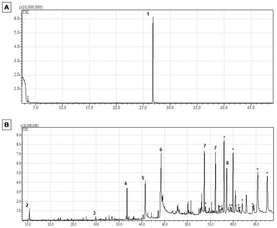 GC-MS chromatographic profiles of potential bioactive compounds present in Brassicaceae extracts obtained by supercritical CO2 extraction. (A) Chromatographic profile of watercress extract; (B) Chromatographic profile of broccoli extract; legend: (1) PEITC; (2) 3-Butenyl isothiocyanate; (3) β-PEITC; (4) SFN; (5) I-(+)-Ascorbic acid 2,6-dihexadecanoate; (6) Ethyl Linoleolate; (7) Tetracontane; (8) 1-Eicosanol; (*) compounds without correspondence in the GC-MS library. (Note: Watercress and broccoli extracts were analyzed at a concentration of 7.3 mM PEITC and 3.4 mM SFN, respectively, which were determined by HPLC-DAD, as described previously [17]).