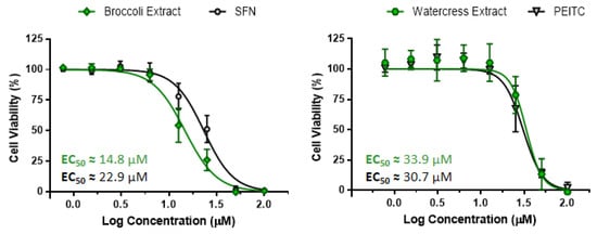 Cytotoxicity of extracts and standard ITCs was assessed using confluent and undifferentiated Caco-2 cells as a model of the human intestinal epithelium, as previously described [17]. Briefly, Caco-2 cells were seeded into 96-well plates at a density of 2 × 104 cells/well and allowed to grow for 7 days, with medium renewal every 48 h. At day 7, cells were incubated with watercress extract and PEITC with concentrations varying from 1.56 to 200 µM and with broccoli extract and SFN between 0.78 and 100 µM, all diluted in culture medium. Cells incubated only with culture medium and cells incubated with the maximum % (v/v) of solvent used were considered as controls–for PEITC and watercress and broccoli extracts a maximum of 2.0%, 2.7% and 2.9% of ethanol (v/v) was used, respectively, whereas for SFN it was used a maximum of 1.0% of DMSO (v/v), to ensure that at the maximum concentrations tested the cytotoxic effects were only dependent on phytochemicals rather than the content of solvent. After 24 h, cells were washed twice with Phosphate Buffered Saline (PBS, Sigma-Aldrich, St. Louis, MO, USA) and cell viability was assessed using CellTiter 96® AQueous One Solution Cell Proliferation Assay (Promega, Madison, WI, USA) containing MTS reagent, according to manufacturer’s instructions. Absorbances were measured at 490 nm using a Spark® 10M Multimode Microplate Reader (Tecan Trading AG, Männedorf, Switzerland) and cell viability was calculated relatively to control with culture medium (without treatment or solvent). Three independent experiments were performed in triplicate.