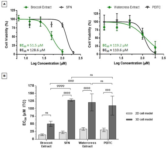 Moreover, to prevent cell proliferation in HT29 spheroids, higher doses of extracts and ITCs were required in comparison with cell monolayers (Figure 3B). In particular, the EC50 value for watercress extract and PEITC showed an increase of approximately 4-fold, and broccoli extract and SFN an increase up to almost 3- and 6-fold, respectively. The general need to increase dose treatment to circumvent the limited anticancer compound diffusion and to have the intended biological response in more complex cellular scenarios, was already verified in 3D cell models of breast and hepatic cancer cells [43,44].