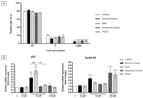 HT29 spheroids were treated for 24 h with Brassicaceae extracts and respective major ITCs to evaluate their effect on cell cycle phase distribution of spheroid-derived cells and to ascertain how they impair cell proliferation even at a dose below the EC50. For this purpose, we tested 83 µM PEITC for watercress extract and 40 µM SFN for broccoli extract, since these are concentrations required to reduce 30% cell proliferation (EC30) in 3D cell spheroids, using the same strategy as other authors [49]. Results showed that the antiproliferative effect promoted by watercress and broccoli extracts, as well as by PEITC and SFN, correlated with G2/M cell cycle arrest, as shown by the higher content of cells in this cell cycle checkpoint when compared to control (Figure 4A). Treatment with both extracts and ITCs led to a shift in the cell cycle profile from G1 and S phases towards G2/M phase, as shown by the discrete reduction in G1-positive cells after treatment with watercress extract (p < 0.05) and in S-positive cells after treatment with both extracts and compounds for 24 h, accompanied by the significant increase in G2/M-positive cells after exposition to broccoli (p < 0.001) and watercress extracts (p < 0.0001), as well as to their main ITCs relatively to control (p < 0.0001), which was practically destitute from cells in this phase.