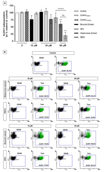 Contrary, both watercress extract and PEITC decreased ALDH1 activity in a dose-dependent manner within the submaximal dose range tested (i.e., ½ and ¼ of extracts’ EC50 values obtained in HT29 spheroids) (Figure 5A). At the highest concentration tested (60 µM PEITC), hitting the threshold, a significant reduction in ALDH1 activity was observed (p < 0.0001). Indeed, this was supported by a decrease in ALDH+ subpopulation from nearly a representative 82% to 61% and to 21% ALDH+ cells, for 30 and 60 µM PEITC, respectively (Figure 5B). Results showed a more pronounced biological response to PEITC compared to watercress extract, suggesting that other compounds present in this extract may antagonize with PEITC, rendering a lower effect in targeting ALDH+ cells.