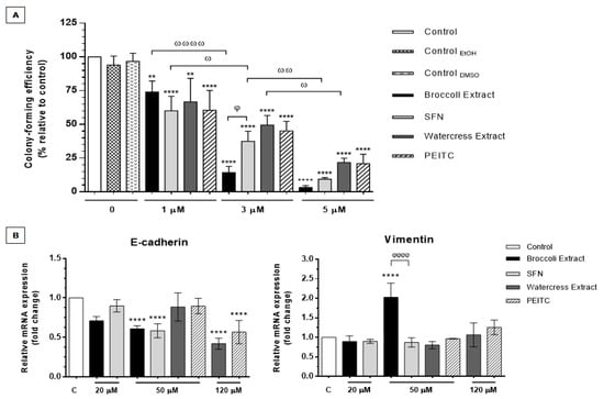 Inhibitory effects of natural extracts and ITCs in anchorage-independent cell growth using cells derived from HT29 spheroids. (A) Inhibition of anchorage-independent cell growth upon a 2-week treatment with natural extracts and ITCs normalized relatively to control without treatment or solvent (100% colony formation efficiency). ** p < 0.01 and **** p < 0.0001 are relative to control; ω p < 0.05, ωω p < 0.01, ωωωω p < 0.0001 are relative to the same compound; φ p < 0.05 is relative to broccoli extract; (B) Analysis of CDH1 and VIM expression (coding for E-cadherin and Vimentin, respectively) by qPCR in HT29 spheroids treated with natural extracts and ITCs for 24 h; data normalized relatively to treatment with the same % (v/v) of solvent used for each extract/compound. GAPDH was used as endogenous control. In the case of the extracts’ EC50 values (50 and 120 µM for broccoli and watercress extracts, respectively) results are expressed as mean of two independent experiments performed in triplicate ± SD. For the tested dose bellow the EC50 value, the results are expressed as mean of one experiment performed at least in triplicate ± SD. **** p < 0.0001 is relative to control; φφφφ p < 0.0001 is relative to broccoli extract.
