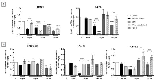 As shown in Figure 7A, watercress extract and PEITC induced PROM1 downregulation in a dose-dependent manner, with watercress extract presenting a more pronounced effect with dose increase from 50 µM (p < 0.05) to 120 µM (p < 0.0001). The same trend was observed for treatment with SFN at 20 µM (not statistically significant) and 50 µM (p < 0.0001). However, this tendency was not applied to broccoli extract since this phytochemical amalgam immediately induced PROM1 downregulation at approximately half of the EC50 value (20 µM), an effect that was maintained even when raising treatment dose to 50 µM (p < 0.0001). In contrast, the same behavior was not observed for LGR5 expression. Our results demonstrated that, although broccoli extract and SFN modulated PROM1 and LGR5 expression, the extract appeared to be less effective than SFN with dose increase (p < 0.0001 and p < 0.001, for PROM1 and LGR5 expression, respectively). Inversely, watercress extract presented higher effect (p < 0.0001) on LGR5 downregulation compared to the absent PEITC effect. This might be probably due to the presence of other compound(s) in broccoli and watercress extracts that may result in an antagonistic or additive/synergistic effect, respectively, with the corresponding ITCs.