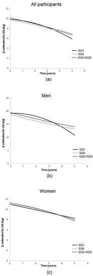 In the model with time (linear and quadratic), 25(OH)D and their interaction (Model 2, Table 2), we observed a U-shaped relationship between baseline GS and 25(OH)D groups in all participants, and for men and women separately. Specifically, both the lowest and highest season-specific 25(OH)D quartiles were associated with weaker GS in men (SQ1: β (SE) = −2.56 (0.96), p = 0.008; SQ4: −2.16 (1.06), p = 0.04) and women (SQ1: −1.10 (0.52), p = 0.04; SQ4: −1.28 (0.50), p = 0.01) compared with those in the middle quartiles. Only SQ1 was associated with a faster rate of GS decline in men, but not in women (Figure 1). Additionally, men in SQ1 experienced an accelerated GS decline of −0.44 kg annually over the 5-year follow-up (p < 0.001) (Model 2). In the restricted cohort, only SQ1 was associated with significantly weaker baseline GS and GS decline over time. After adjustments for key covariates (Model 3, Table 2, Figure 1), being in SQ1 was associated with GS decline of 1.41 kg (p = 0.003) per year which accelerated over time (−0.40 (0.1), p < 0.001) in men, but not in women. All participants in SQ1, as well as SQ1 participants who were also unsupplemented (restricted cohort), experienced accelerated GS decline over the follow-up period compared with participants belonging to combined middle quartiles (Figure 1).