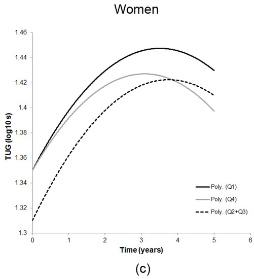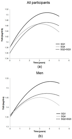 In the model with time (linear and quadratic), 25(OH)D and their interaction (Model 2, Table 3), a U-shaped association between baseline TUG and the lowest and highest season-specific 25(OH)D quartiles was observed in all participants and in women. The U-shaped relationship remained in women after adjustment for anthropometry, health-related variables and use of walking aids (SQ1: 0.04 (0.02), p = 0.04; SQ4: 0.04 (0.02), p = 0.03) (Model 3). However, the interaction terms between 25(OH)D quartiles and time were not significant indicating that the rate of decline in TUG did not differ by 25(OH)D group membership over 5 years in all participants, men and women (Figure 2).