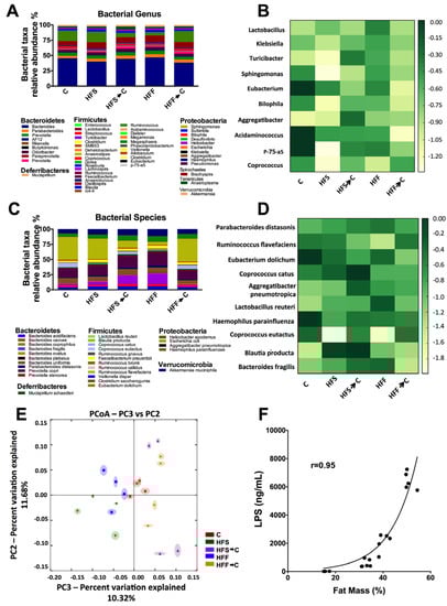 High-fat sucrose (HFS) or high-fat fructose (HFF) diets differentially modified the gut microbiota. Relative abundances of the gut microbiota at the bacterial genus (A); heat map showing the 10 most modified genera (B); relative abundances at the specie level (C); and heat map showing the ten most modified species (D) after the consumption of HFS or HFF diets. Unweighted principal component analysis (PCA) of gut microbiota after the consumption of different diets (E). The closer the spatial distance between samples the more similar they are with respect to both axes (PERMANOVA, p = 0.001). Correlation between serum LPS concentration and percent fat mass (r = 0.95) (F). The data are expressed as the mean ± SEM (n = 4). Results were considered statistically significant at p < 0.05. The differences between groups are indicated by letters, where a > b > c. C: control; HFS: high-fat and sucrose; HFS→C: high-fat and sucrose, switched to the control diet; HFF: high-fat and fructose; HFS→C: high-fat and fructose, switched to control diet.