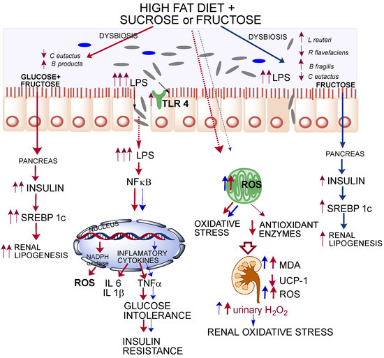 The combination of a high-fat with sucrose (HFS) or fructose (HFF) diet differentially modified the gut microbiota and increased the paracellular transport of LPS generating a chronic state of high-grade inflammation. The HFS diet increased to a higher extent renal lipogenesis and inflammatory markers compared with the HFF diet. As a consequence, there was an increase in glucose intolerance and insulin resistance. Consumption of HFS or HFF diets increased the formation of reactive oxygen species (ROS) and renal oxidative stress.