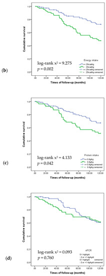 Kaplan–Meier survival curves showing 120-month survival according to nutritional markers: (a) Malnutrition Inflammation Score; (b) energy intake; (c) protein intake; and (d) nPCR.