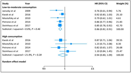 | Subgroup | Low-to-Moderate Chocolate Consumption | High Chocolate Consumption | ||||||