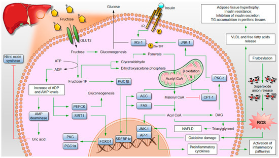 Role of fructose on metabolic diseases. Fructose reduces the phosphate biodisponibility, leading to acid uric production and nitric oxide synthase inhibition contributing to hypertension. Reduced phosphate biodisponibility also activates SIRT-Dependent deacetylase of FoxO1 contributing to gluconeogenesis and hyperglycemia. Fructose-1P upregulates PGC-1β expression by promoting lipogenesis through SREBP1c activation. The same nutrient provides carbon chains for the synthesis of triglycerides, diacilglycerides, and VLDL cholesterol contributing to hypertriglyceridemia, hepatic insulin resistance, and dyslipidemia. Sub products of fructose target other tissues, leading to systemic insulin resistance and inflammation. Finally, ROS generated by fructosylation increases oxidative damage and stress response in the inner of cell, leading to DNA damage and proinflammatory cytokines production. ACC: acetyil-coA carboxylase; ACC: Acetyl-CoA Carboxylase; ADP: Adenosine Diphosphate; AP-1: Activator Protein-1; ATP: Adenosine Triphosphate; CPT-1: Carnitine Palmitoyl Transferase 1; DAG: Diacylglycerol; FAS: Fatty Acyl-CoA Synthase; FoxO1: Forkhead box protein 01; Fructose-1P: Fructose 1-Phosphate; GLUT2: Glucose Transporter 2; IR: Insulin Receptor; IRS-1: Insulin Receptor Substrate 1; JNK-1: C-Jun-N terminal kinase-1; NAFLD: Non-Alcoholic Fat Liver Disease; PEPCK: Phosphoenolpyruvate Carboxykinase; PGC-1α: Peroxisome Proliferator-Activated Receptor-Gama Coactivator 1 Alpha; PGC-1β: Peroxisome Proliferator-Activated Receptor-Gama Coactivator 1 Beta; PKC: Protein Kinase C; ROS: Reactive Oxygen Species; SIRT-1: Sirtuin-1; SREBP1c: Sterol Regulatory Element-Binding Protein 1c; TG: Triglycerides; VLDL: Very Low Density Lipoprotein.