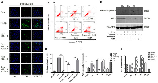 Effects of curcumin on IL-1β-induced apoptosis in primary chondrocytes. (A) Apoptotic cells were visualized using terminal deoxynucleotidyl transferase mediated dUTP nick end labeling (TUNEL) fluorescence immunocytochemistry (green). Nuclei were counterstained with 4′,6-diamidino-2-phenylindole (DAPI) (blue); (C) Flow cytometric detection of apoptosis in the chondrocytes. Apoptotic cells labeled with Annexin V and propidium iodide (PI) fluorescence were estimated by flow cytometry. The percentages of cells in each quadrant is indicative of: upper left, necrotic cells; lower left, live cells; lower right, early apoptotic cells; and upper right, late apoptotic cells; (D) Accumulation of cleaved caspase 3 and bcl-2 was visualized by western blot. Results shown in (B,E,F) are expressed as means ± SD for experiments performed in triplicate. * p < 0.05, ** p < 0.01, and *** p < 0.001.Con, control; Rap, rapamycin; Cur, curcumin; 3-MA, 3-Methyladenine.