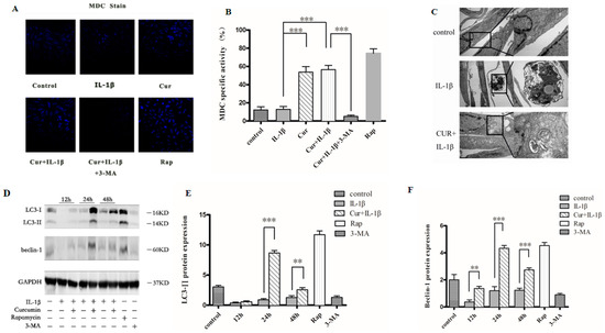 Curcumin activated autophagy within chondrocytes. The curcumin induced autophagy was detected by monodansylcadaverine (MDC) staining ((A), quantified in (B)) and transmission electron microscope (TEM) (C) at 24 h. Accumulation of autophagosomes was observed in chondrocytes that were pretreated with curcumin (C). Accumulation of beclin1 and light chain 3 (LC3)-II upon autophagy activation was visualized by western blot ((D), quantified in (E) and (F)). Results in (B,E,F) are expressed as means ± SD for experiments performed in triplicate. * p < 0.05, ** p < 0.01, and *** p < 0.001. Cur, curcumin; Rap, rapamycin; 3-MA, 3-Methyladenine.