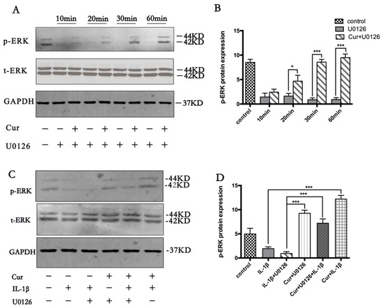 Furthermore, we also investigated whether the protective effect of curcumin against IL-1β was related with phosphorylation of ERK1/2. Primary chondrocytes were incubated with IL-1β (10 ng/mL) or U0126 (10 μM) alone for the indicated time or were preincubated with curcumin (10 μM) for 2 h and then co-treated with IL-1β (10 ng/mL) or U0126 (10 μM) for the indicated time. As shown in Figure 5C,D, pretreatment with curcumin significantly upregulated the level of p-ERK1/2 in co-treated IL-1β or U0126-stimulated cultures compared with primary chondrocytes stimulated with IL-1β and U0126 alone (p < 0.001).