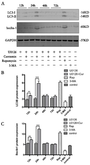 Curcumin could activate autophagy for U0126-induced inhibition of ERK1/2 in primary chondrocytes. Accumulation of beclin-1 and LC3-II upon autophagy activation was visualized by western blot ((A), quantified in (B) and (C)). Results in (B,C) are expressed as means ± SD for experiments performed in triplicate.* p < 0.05, ** p < 0.01, and *** p < 0.001. Rap, rapamycin; 3-MA, 3-Methyladenine.
