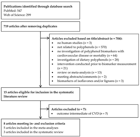 Two authors (JR and JB) independently screened the titles and abstracts of the publications. A third acted as a moderator (UN), to remove any discrepancies. Articles were retained for review if the following inclusion criteria were met: (1) investigation of multiple, adjusted associations between polyphenol biomarker(s) and CVD risk or mortality; (2) use of an observational study design; (3) the study involved humans; and (4) the study was published in a scientific journal (conference abstracts and comments were excluded).