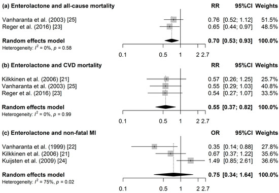 Forest of the association between enterolactone and (a) all-cause mortality; (b) CVD-mortality; and (c) non-fatal MI.