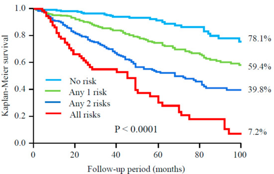 During follow-up period (median 46 months), 39 patients moved to other institutions and 9 underwent kidney transplantation, and they were censored at the point of dropping out. A total of 283 (29.1%) patients died including 123 (12.6%) due to CVD. An abnormal ABI (adjusted HR 1.62, 95% CI 1.13–2.32, p = 0.0096), a GNRI <91.2 (adjusted HR 1.57, 95% CI 1.06–2.33, p = 0.023), and a CRP >1.9 mg/L (adjusted HR 1.89, 95% CI 1.31–2.77, p = 0.0007) were independent predictors for mortality due to CVD, respectively (Table 4). Furthermore, when patients were divided into groups according to number of these three risk factors, 8-year freedom from mortality due to CVD was 87.7%, 78.9%, 68.3%, and 35.1% among groups with no risk factor, any single risk factor, any two risk factors, and all risk factors, respectively (p < 0.0001) (Figure 1). As for all-cause mortality, a similar tendency was also seen among four groups (p < 0.0001) (Figure 2). Patients with all risk factors had 5.26-fold (95% CI 2.51–11.3, p < 0.0001) higher risk for mortality due to CVD compared to those without any risk factor after adjustment for other confounders. Similar results were obtained in all-cause mortality (adjusted HR 7.97, 95% CI 4.88–13.2, p < 0.0001) (Table 5).