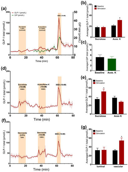 Intra-arterial administration of sucralose and stevioside significantly stimulated GLP-1 secretion (sucralose: 51.3 ± 5.9 pmol/L vs. baseline: 33.9 ± 3.9 pmol/L, p < 0.05, n = 6; stevioside: 54 ± 6.4 pmol/L vs. baseline: 31.5 ± 2.3 pmol/L, p < 0.05, n = 6, Figure 2d–g). However, vascular acesulfame K did not change the secretion rate (Figure 2d,e). The results were unchanged by the administration of acesulfame K before sucralose, suggesting that it is not the unavailability of the receptor that is responsible for the lack of the response to acesulfame K (data not shown). Sucralose slightly elevated GIP concentrations, although not significantly (sucralose: 9.3 ± 2 pmol/L vs. baseline: 7.2 ± 1.2 pmol/L, p = 0.09, n = 5, Figure 3c,e).