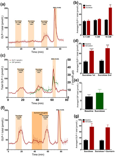 Stimulating the intestine with 10 mM of sucralose resulted in two secretory responses that did not differ (p = 0.25) (sucralose 1: 45 ± 2.8 pmol/L vs. baseline 1: 23.5 ± 1.7 pmol/L, p < 0.0001; sucralose 2: 50.3 ± 5 pmol/L vs. baseline 2: 25.2 ± 2.2 pmol/L, p < 0.001, n = 6, Figure 3c,d), which allowed us to test whether the sucralose-induced GLP-1 secretion could be inhibited by gurmarin.
