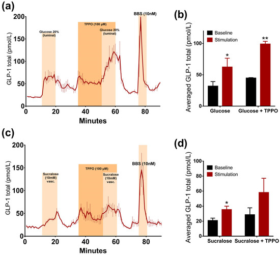 Sucralose-induced GLP-1 secretion was not reduced in the presence of the TRPM5 inhibitor TPPO. There was no significant difference between the responses to the administration of sucralose alone or sucralose concomitantly with TPPO, when comparing the baseline-subtracted responses (p = 0.11). Sucralose increased GLP-1 levels by around two times when infused alone or together with TPPO (sucralose: 35.4 ± 2.7 pmol/L vs. baseline 1: 20.7 ± 1.9 pmol/L, p < 0.05; sucralose + TPPO: 58 ± 11 pmol/L vs. baseline 2: 28.6 ± 2.3 pmol/L, p = 0.07, n = 3, Figure 4c,d). Interestingly, TPPO increased GLP-1 secretion when given alone (Figure 4).