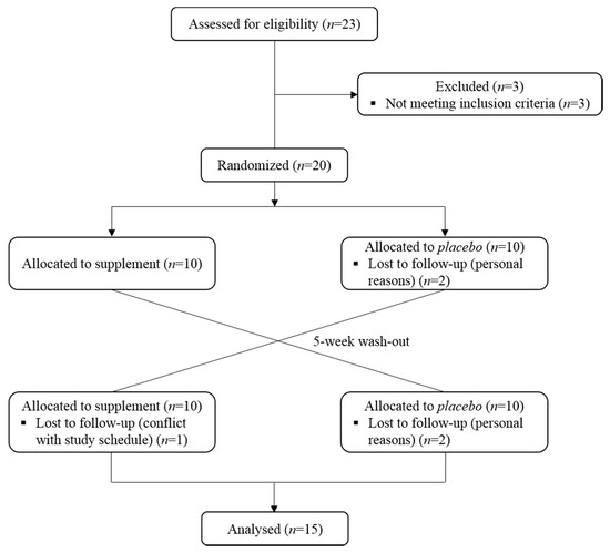 Twenty-three volunteers were assessed for eligibility and three of them did not meet the inclusion criteria and were excluded from participation in the study. Among the twenty volunteers recruited in the study, four did not report to the Research Center for personal reasons and one did not complete the exercise protocol due to conflict with their study schedule (Figure 2).