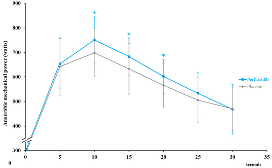 Anaerobic mechanical power (W) developed during a 30-s Wingate bout and representing the total anaerobic work capacity (J/30 s). Values are means ± SD, n = 15 (placebo) or n = 15 (PerfLoad®). * Superscript indicates an intergroup difference between PerfLoad® and placebo, p < 0.05.