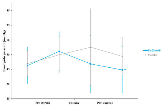 Blood pulse pressure (mmHg) measured 60 min before and just before (Pre-exercise), just before and just after (Exercise), just after and 60 min after (Post-exercise) a 30-s Wingate bout. Values are means ± SD, n = 15 (placebo) or n = 15 (PerfLoad®). * Superscript indicates an intergroup difference between PerfLoad® and placebo, p < 0.05.