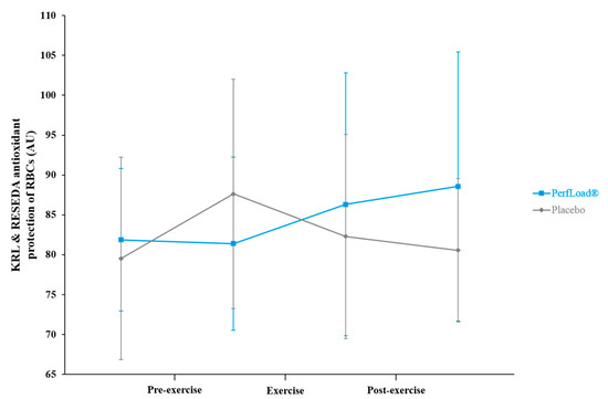 KRL and RESEDA global antioxidant protection of red blood cells (RBCs) (arbitrary units) measured 60 min before and just before (Pre-exercise), just before and just after (Exercise), and just after and 60 min after (Post-exercise) a 30-s Wingate bout. Values are means ± SD, n = 15 (placebo) or n = 15 (PerfLoad®). * Superscript indicates an intergroup difference between PerfLoad® and placebo, p < 0.05.