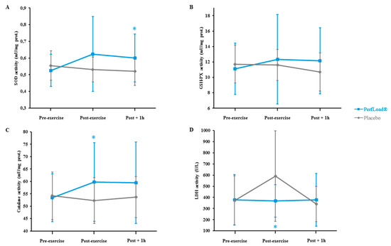 SOD (A), GSH-PX (B), Cat (C), and LDH (D) activities measured just before (Pre-exercise), just after (Exercise), and 60 min after (Post-exercise) a 30-s Wingate bout. Values are means ± SD, n = 15 (placebo) or n = 15 (PerfLoad®). * Superscript indicates an intergroup difference between PerfLoad® and placebo, p < 0.05.