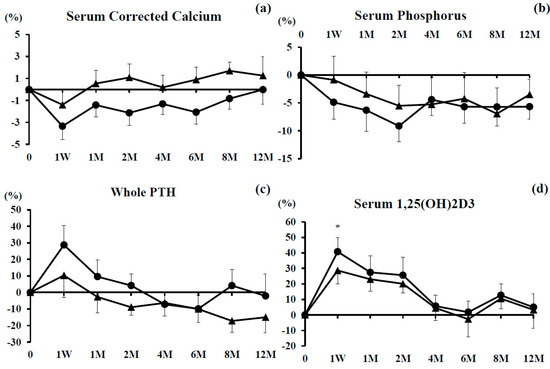 The percent change of serum whole PTH increased at 1 week and then decreased gradually during the study period in both groups, with no significant differences between them (Figure 1c).