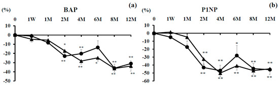 The percent change of serum P1NP tended to decrease from 2 to 12 months in both groups, with no significant difference between the groups (Figure 2b).