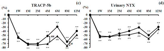 The percent change of TRACP-5b was significantly decreased at every time point compared with baseline in both groups. There were significant differences at 4 and 8 months between the groups. Decreased TRACP-5b tended to return to baseline at 6 and 12 months of treatment (Figure 2c).