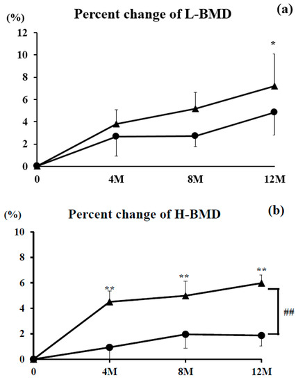 Percent changes in lumbar bone mineral density (L-BMD) (a) and bilateral total hip BMD (H-BMD) (b) over the 12-month study period. Closed circles show the denosumab monotherapy group and closed triangles show the combination group. Double asterisks (**) denote significant differences (p < 0.01) at each time point compared with pretreatment in the denosumab monotherapy or combination groups. Double hashtags (##) show significant differences (p < 0.01) between the denosumab monotherapy and combination groups at each time point.