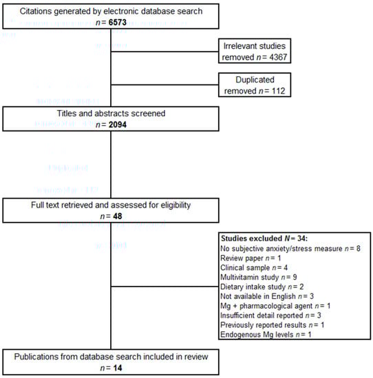 The research synthesis was limited to intervention studies in human adult samples (≥18 years old.) that administered a Mg dose in isolation or combined with a maximum of 5 additional ingredients, and reported an outcome measure of subjective anxiety or stress. This included any general subjective measure that included subscales related to stress and anxiety symptomology. Intervention studies examining acute and chronic effects of Mg manipulations were included. Studies examining the effects of Mg depletion (in the absence of an intervention) or increased consumption of diets associated with high Mg content were excluded. Studies reporting effects in individuals with significant health conditions (e.g., cancer, chronic fatigue syndrome) and developmental disorders (e.g., autism) were excluded. Samples recruited on the basis of mild to moderate subjective anxiety, hypertension, or subjective symptoms associated with premenstrual syndrome (PMS), were retained. The efficacy of Mg intake has been examined as a novel and adjunct treatment approach for depression. This literature has been adequately summarised in a number of previous systematic reviews (e.g., [10,11]). Therefore, studies reporting the effects of Mg intake in depressed samples are not reviewed here. Publications were required to be in the English, French or German languages to permit review by authors. Studies failing to report sufficient detail to permit accurate characterisation of the methodological approach were also not included in the review. Minimum reporting requirements were sample size and composition, Mg dose and intervention length, and clearly defined outcome measures of subjective anxiety or stress.
