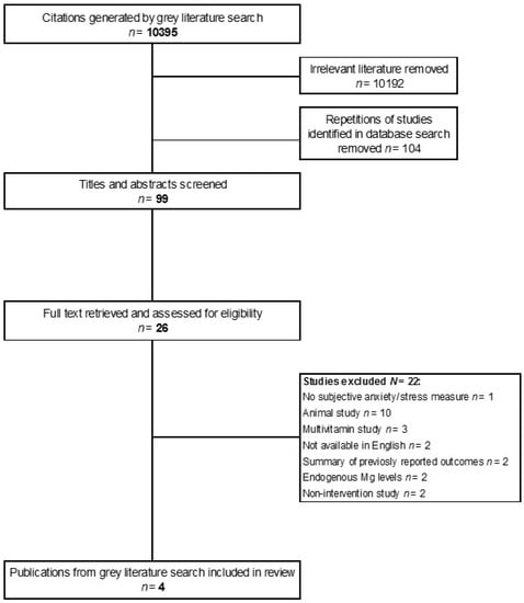 A grey literature search was also undertaken (September 2016) using grey literature search engines, a google scholar search, and targeted websites using the search terms ‘magnesium’ AND ‘anxiety’ OR ‘stress’. A full list of employed grey literature resources is shown in Appendix A. A request for unpublished data was also published in Magnesium Research [57] and circulated on Researchgate.net. A total of 10,395 citations were screened for relevance. A summary of the grey literature search is shown in Figure 2. The search returned 4 relevant studies which were included in the review. All 4 studies were unpublished in full form at the time of the search. One study is cited in a European Food Safety Authority (EFSA) scientific opinion claim on Mg supplementation [58]. Three internal studies conducted by Sanofi S.A were included in the review. A conference abstract of the Rouillon et al. study was published in 1995 [59]. Two studies by Caillard [60,61] have not been published. Full data from these studies were provided by Sanofi, France. A short summary of these data has been published previously [62].