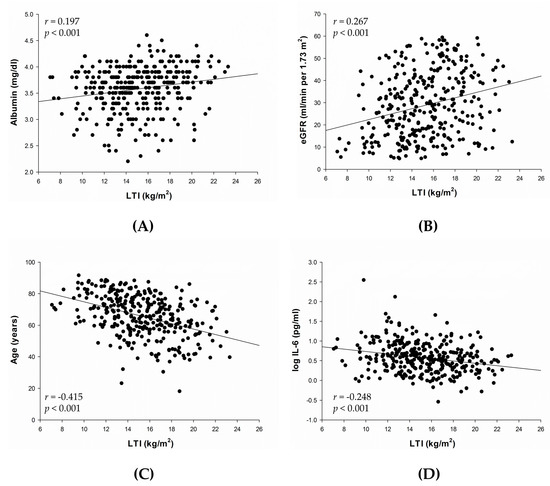In univariate analysis, LTI was positively associated with body mass index (r = 0.284, p < 0.001) and negatively associated with fat tissue index (r = −0.432, p < 0.001). Correlations between LTI and other variables are presented in Figure 1A–D. LTI was positively correlated with serum albumin (r = 0.197, p < 0.001) (Figure 1A) and eGFR (r = 0.267, p < 0.001) (Figure 1B), and negatively correlated with age (r = −0.415, p < 0.001) (Figure 1C) and log IL-6 (r = −0.248, p < 0.001) (Figure 1D).