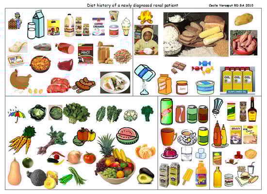 To simplify renal diet education of illiterate or non-English speaking CKD patients in South Africa, we tried to overcome these difficulties by using illustrations, symbols, and colors to replace writing. This was achieved by developing a five-step visual approach to the renal diet, which we called “Eating like a Rainbow”, to try to increase interest and emphasize that following a diet is not necessarily an unpleasant or grim experience. Compliance is ultimately the goal of nutritional intervention in CKD; comprehension is the key for obtaining compliance [21,22,23,24,25,26,27]. The material whose development is here described was developed using a trial-and-error approach over a 4-year period in the renal unit of a large public facility serving lower socio-economic patients without medical insurance.