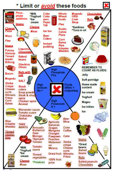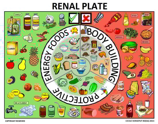 - Ameh, O.I.; Cilliers, L.; Okpechi, I.G. A practical approach to the nutritional management of chronic kidney disease patients in Cape Town, South Africa. BMC Nephrol. 2016, 17, 68. [Google Scholar] [CrossRef] [PubMed]