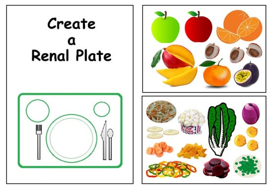 Furthermore, the educational game: “Create your renal plate” (Figure 11) was initially developed for children, but proved to be useful also with adult patients: it consists of 10 pages with color illustrations of food in all the food groups. These illustrations need to be cut out to build a plate, and the game provides useful information on eating habits, reflected in different food choices.