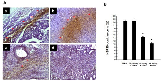 3.2. PE Suppressed HSP90 Expression during DMBA Mammary Tumorigenesis