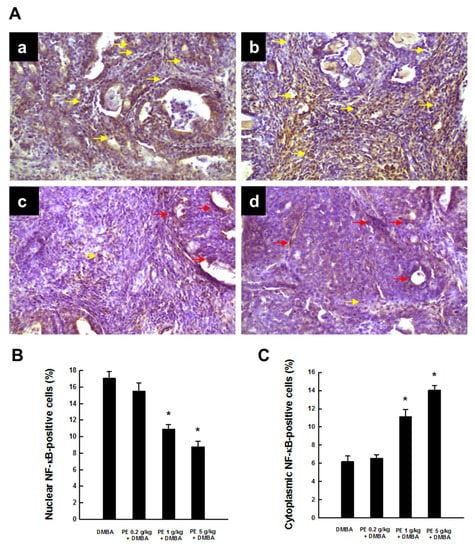 3.3. PE Inhibited Activation of NF-κB during DMBA Mammary Tumorigenesis