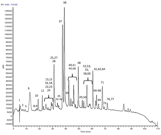 To the best of our knowledge, the metabolite profiles of GABA oolong tea were yet to be studied. So, the metabolite profiling of GGABA and OGABA extracts were determined through RP-HPLC-PDA-ESI-MSn analysis, which allowed for the identification of 53 compounds, listed in Table 2. The identification was performed through comparison of experimental data (chromatographic behavior, UV-Vis, MS and MSn spectra, Table 2) with that available in the literature. Figure 1 shows, as an example, a OGABA chromatogram, acquired as total scan PDA.