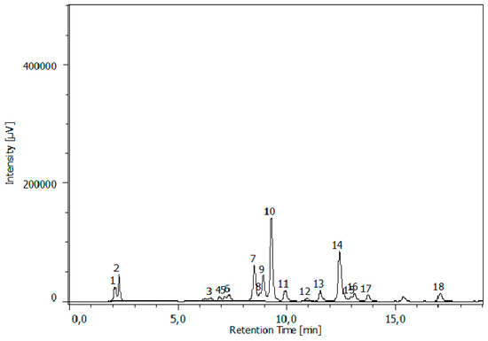 HPLC/FLD chromatograms of GGABA extract at the concentration of 0.5 mg/mL, respectively. The analysis showed the presence of (1) aspartic acid; (2) glutamic acid; (3) serine; (4) glutamine; (5) glycine; (6) threonine; (7) alanine; (8) arginine; (9) GABA 1; (10) theanine; (11) tyrosine; (12) cysteine; (13) valine; (14) GABA 2; (15) phenylalanine; (16) isoleucine; (17) leucine; (18) proline.