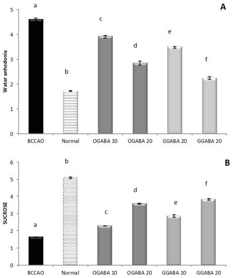 Volume of water (A) and sucrose solution (B) consumption in stroke-induced anhedonia model. Data are shown as a mean (mL) ± SD (n = 3); different letters indicate statistically significant differences (p < 0.05) between the two groups.