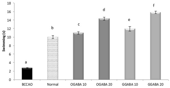 TST is a common behavioral test used for the evaluation of new potential antidepressant drugs in unavoidable and unescapable stress conditions. During the 6 min of test duration, one parameter (immobility time) is registered, which is reduced effective antidepressant agents. As shown in Figure 7, the oral administration of GGABA and OGABA extracts produced a significant (p < 0.05) reduction of the immobility time, with GGABA and OGABA showing the same activity (p > 0.05) at the lowest dosage (10 mg/kg). At the highest concentration (20 mg/kg), GGABA was once more found to be the most active. In our previous review article, we formulated the hypothesis that polyphenols could assume a positive role in the management of PSD, due to their antioxidant activity [19].