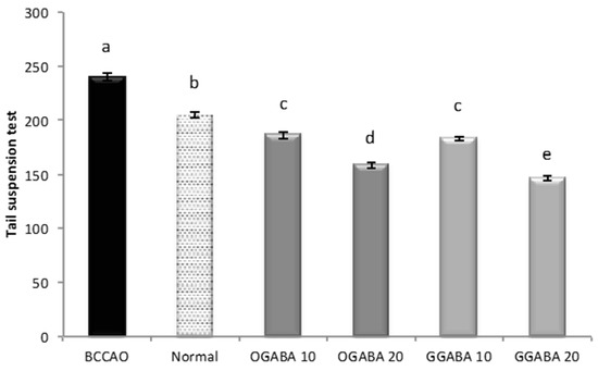 Effects of oral administration of OGABA and GGABA extracts on immobility time in tail suspension model. Data are mean(s) ± SD (n = 7); different letters indicate statistically significant differences (p < 0.05) between the two groups.